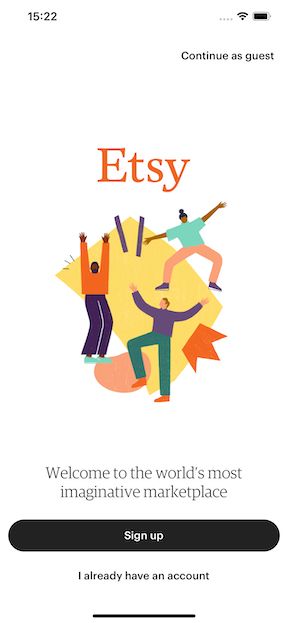 Here, users first see a login screen, similar to our own login screen but there is a “continue as guest” button. This allows a user to start browsing without having to create an account first. The user is only prompted to create an account at checkout.